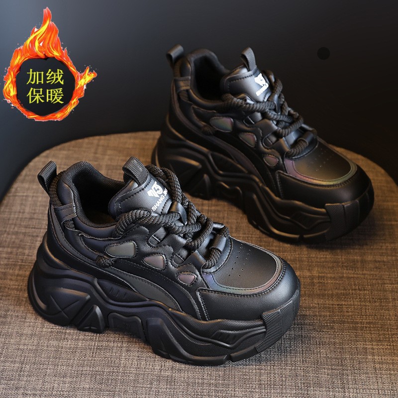Genuine Leather Sponge Cake Thick Soled Dad's For Women In Autumn 2024, New Round Toe Lace Up Inner Height Increase