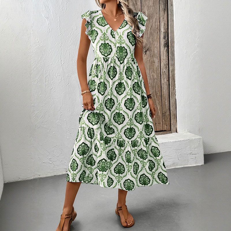 New European Cross-Border Retro Style Geometric Print Ruffle Sleeveless Dress With Unique Design